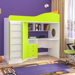Двухъярусная кровать Кадет-1 с рабочей зоной имеет также встроенный шкаф, рабочий стол с тумбой, в которой находятся три выдвижных ящика, в которых все необходимое для учебы, рисования, чтения или другого хобби всегда будет под рукой. Для большего удобства, над столом расположены полки. В боковой части конструкции со стороны стола есть отверстие, благодаря которому на рабочую поверхность будет попадать естественное освещение из окна. Спальное место расположено на втором ярусе, к нему ведет прочная металлическая лесенка, сама кровать сверху оснащена бортиками, что гарантирует безопасность ребенка во время сна, даже если он спит беспокойно, такие бортики не дадут ему упасть.